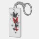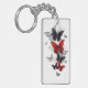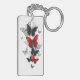 Montón de mariposas voladoras, realistas, rojas y negras morfo sobre fondo blanco con gotas de pintura.