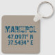 Diseño moderno de la cadena de teclas con características coordenadas de latitud y longitud para Mariupol, Ucrania con fuente azul oscuro en peligro en fondo de taupe