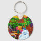 Cadena de claves con el maestro de pintura animal de Louis Wain del Cat College (1860-1939). Un bonito gato blanco con ojos azules llamativos se sienta preponderantemente al lado de una vibrante variedad de hermosas flores. La majestuosa escuela de gatos se cierne sobre el fondo bajo un cielo rosa y azul. Un regalo maravilloso para los amantes de los gatos y el arte inglés.