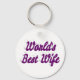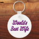 Cadena de claves con la mejor esposa del mundo en texto en 3D morado. Las cadenas de clave redonda y cuadrada están disponibles en varios tamaños.