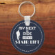Mi próxima travesía será un elevador de escalera con letras mayúsculas y blancas mezcladas con una imagen de icono de un auto, la silueta de un ciudadano mayor caminando con un bastón. Se coloca dentro de un círculo blanco de puntos sobre azul oscuro sólido.