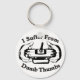 Este diseño en blanco y negro muestra a una persona sosteniendo un transmisor de radio con la leyenda que sufro de pulgares tontos.