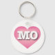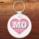 Este llavero presenta un corazón tranquilo, fresco y recogido de color rosa con un centro blanco lavado que contiene las letras negrita y blanca del funda superior MO, la abreviatura oficial del estado de Missouri, el estado Show Me.