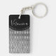 Un elegante y oscuro patrón de arlequín rhomboide plateado en un fondo brillante de plata junto con un cartel negro en la parte superior donde se puede personalizar con un nombre, frase o logotipo haciéndolo exclusivamente propio. Moda Glam temática moderna