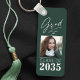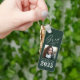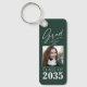 Un moderno, nuevo, de dos lados, sólido aluminio, cadena de teclas Graduate - anillo de llaves con tu foto en la parte delantera. Todo personalizado, con "Grad" en elegante escritura caligráfica con tinta con "Clase de, El año, Nombre escolar y su nombre" en tipografía moderna. La foto del graduado se acentúa artísticamente con un delicado gradiente. El texto y el guarnecido son blancos, con un fondo de color verde menta moderno. Si lo desea, edite fácilmente el color de fondo del color primario de su escuela. La idea perfecta de regalo de graduación para estudiantes de secundaria, universitarios y universitarios.