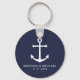 Moderno Ancla Náutica Minimalista Anclaje azul Wedding Favor Keychain con ancla blanca y nombre personalizado de novia y novio con fecha boda en blanco moderno sans serif estilo tipo de letra sobre fondo azul marino. Perfecto para bodas náuticos, boda con temática playera y más.