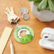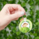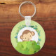 Cadena de llaves con un ilustracion personalizado de un mono que asoma por detrás de un arbusto verde. Rodeado por una corona de hojas tropicales. Situado sobre un fondo de color verde oliva.