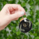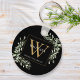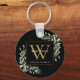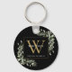Llavero de monograma de nombre de hojas de verde acuarela elegante con una inicial de monograma dorado sobre un fondo negro chic. Diseñado por Thisisnotme©