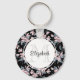 Un llavero con un elegante patrón hecho con un ilustracion acuarela de flores rosadas con hojas y tallos de color gris azul. Fondo negro oscuro. Un círculo blanco se cubrió encima con su nombre y monograma inicial dentro.
