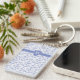 Una Keychain acrílica Oblong muy elegante para personalizar con tu Monograma, con un patrón de perwinkle azul en bonito blanco. Parte de la colección Posh y Painterly 'Periwinkle Patch', este diseño se puede personalizar para que se ajuste a cualquier cadena de teclas Square u Oblong y el tipo de letra también se puede personalizar.
