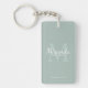 Los regalos personalizados de Bridesmaids presentan el nombre personalizado de la dama de honor en el estilo de tipo de letra blanco clásico y monograma en el estilo de tipo de letra sage green classic serif como fondo con título y fecha boda en el estilo de tipo de letra serif clásico blanco en el fondo verde sabio. También es perfecto para criada de honor, chica de flores, madre de la novia y más.