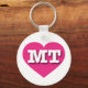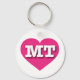 Este anillo de claves presenta un vibrante corazón rosado caliente que contiene las letras altas y blancas del funda MT, la abreviatura oficial de Montana, el estado del tesoro.