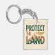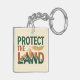 Esta cadena de claves audaz y con conciencia ecológica incluye la frase "PROTEGER LA TIERRA" con la palabra "TIERRA" que incorpora un ilustracion de cordillera impresionante. El diseño utiliza una paleta de colores de alto contraste de verde profundo, naranja oxidado y oro. Una detallada pluma en línea flota sobre el diseño, añadiendo un poderoso elemento de inspiración indígena.