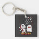 Playful bandaged mummy beside a Boo tombstone under a red starry rain. Bold orange text and retro cartoon vibe make it stand out on Halloween apparel and gifts.