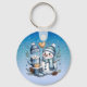 Ilustración invernal encantadora con un muñeco de nieve sonriente, bufanda a rayas, taza azul de cacao, botas y acentos de pino. Paleta azul suave, acentos cálidos y ambiente acogedor de temporada.