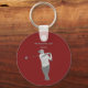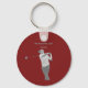 The keychain features a calm design in dark red tone. An stylish man playing Golf. He is focused on his shot.