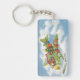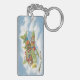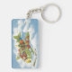 Ilustracion de época Feliz Navidad viaje y diseño de transporte con un alegre Santa Claus volando un avión de hélice a la antigua en el cielo con elfos, juguetes, muñecas, regalos envueltos y un árbol de Navidad en el ala. Están volando el avión antiguo a través de las nubes blancas onduladas y las estrellas en el cielo azul sobre un bonito y pintoresco pueblo y bosque con árboles cubiertos de nieve en la temporada invernal.
