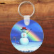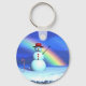 Imagen 3d de un lindo muñeco de nieve parado frente a un arco iris usando un gorra rojo y sosteniendo un bastón de caramelo.
