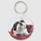 Shih Tzu blanco y negro en la cadena de fotos de Navidades de tierras rojas