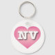Este llavero presenta un corazón tranquilo, fresco y colectado de color rosa con un centro blanco lavado que contiene las letras negrita, blanca y funda superior NV, la abreviatura oficial de Nevada, el estado plateado.