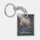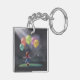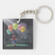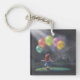 Una linda niñita con una camisa rosa y una falda azul sostiene cinco globos de colores. Ella está trayendo un manto de brillo a un mundo oscuro. A lo lejos se encuentra un edificio gris rodeado de brumas, árboles oscuros y montañas.