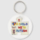 Un pedazo grande del rompecabezas, un corazón integrado por pedazos del rompecabezas, una figura chica cabelludo trigueno del palillo, y el texto que me lee "aman a un niño con autismo" en las camisetas de la conciencia del autismo, las tazas, las tarjetas, los pegatinas, las bolsas de asas, los imanes, los llaveros, los diarios, los mousepads, y otros artículos de la ropa y del regalo.