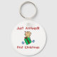Un adorable bebé con un pacificador y un gran regalo de vacaciones y texto que dice "¡Acabo de llegar! Primera Navidad" se presenta en el niño de la primera Navidad bolsos de té, camisetas y más.