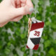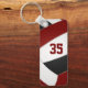 Este llavero temático sobre voleibol presenta la imagen abstracta y sobredimensionada de un marrón, un voleibol blanco y negro en la parte delantera, sobre el cual se puede personalizar el número de camiseta del atleta - al revés, el nombre del atleta sobrepasa un fondo de marrón sólido - de katz_d_zynes