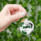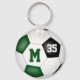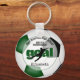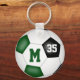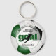 Este equipo colorea el llavero de fútbol con la palabra "gol" con la silueta superpuesta de una jugadora de fútbol que patea una minúscula pelota de fútbol más fácilmente nombre de atleta de personalizable, nombre de escuela/club y mascota y año en la parte delantera y número de camiseta o de jugador en la parte posterior - fondo en la parte delantera y trasera es la imagen realista de una pelota de fútbol que tiene paneles verdes, negros y blancos - por katz_d zynes