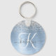 Personalice fácilmente este diseño de moda de la cadena de teclas de la moda con un purpurina brillante de bonito plateado sobre un fondo metálico de color azul.
