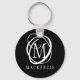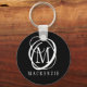 Cadena de claves elegante y elegante personalizada con un monograma decorativo o inicial en blanco con un nombre en un fondo negro editable. CAMBIOS: Cambie el color de fondo, elija un fondo gráfico de estilo o cambie el estilo, color, tamaño y ubicación del tipo de letra del texto haciendo clic en PERSONALIZAR MÁS AÚN debajo de la sección PERSONALIZAR. Póngase en contacto con el diseñador a través de Zazzle Chat o makeitaboutyoustore@gmail.com si desea modificar este diseño, en otro producto o si desea coordinar elementos.