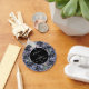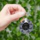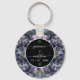 Un llavero de boda audaz y sofisticado que presenta ilustraciones florales dramáticas de color azul polvoriento y gris sobre un fondo negro intenso. La tipografía blanca crujiente y la disposición clásica establecen un tono elegante y melancólico. Perfecto para una velada formal o una boda sofisticada.