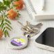 Metal keychain with the non-binary pride flag with little hearts in the center of the design. Black, purple, white, and yellow flag of the enby pride movement; with an editable text field for your name or message
