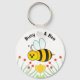 Una abeja amarilla y negra con las palabras Ocupado como abeja en texto curvo arriba. Debajo hay flores amarillas, rojas y verdes.