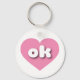 Este llavero presenta un corazón tranquilo y fresco de color rosa que contiene las letras negrita, redondeadas, blancas bajas fundas ok, una versión lúdica de la abreviatura de Oklahoma, el estado anterior.