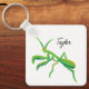 Este llavero presenta un ilustracion pintado de una mantis rezadora en verde brillante con acentos naranjas y está listo para ser personalizado con un nombre en letras de escritura negras.