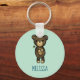 Un llavero personalizado con un simple ilustracion de un oso marrón personalizado sosteniendo una margarita amarilla. Hola escrito sobre su cabeza.