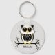 Keychain botón básico con búho de oro, negro y blanco en una extremidad con hojas y bayas.