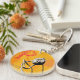 Ampolla seca blanca y negra sobre un fondo amarillo vibrante con "P" decorativo rojo. Una impactante imagen gráfica floral con el nombre de amapola en inglés y latín. Un toque de color para ayudarle a encontrar rápidamente sus llaves.