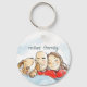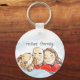 Este llavero tiene el ilustracion de un adorable cachorro y sus padres, un calvo y una morena. Puede personalizar del texto.