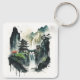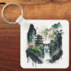 Una hermosa cadena de claves que muestra un ilustracion de tinta de un paisaje con la arquitectura antigua china y majestuosas cascadas.