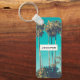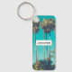 Keychain personalizado con una hermosa fotografía. Palmeras altas con largos baúles delgados frente a un hermoso cielo verde. Esquema de color retro. Relajante y relajante.