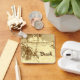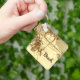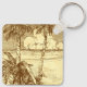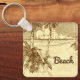 Una cadena de llaves personalizado con escritura retro y letras en bloque de color marrón, con un grabado tropical marrón de palmeras en una playa de arena y hermosas nubes sobre olas oceánicas tranquilas sobre un falso fondo de pergamino.