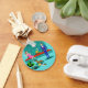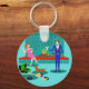 Esta Pareja Retro con Keychain de botón de perro parece una escena de una comedia romántica. El estilo de los años 60, con un diseño de arte minimalista, cuenta con una atractiva pareja que disfruta de una velada romántica en casa. La sofisticada sala cuenta con una chimenea de agua y ladrillo verde azulado con una cornisa de color rojo intenso. Una hermosa mujer pelirroja con un vestido brillante y rosa está encaramada en la cornisa. Está disfrutando de un martini con una aceituna flotante, un fuego ruidoso, buena música y la compañía un hombre alto, oscuro y guapo. El hombre lleva puesto un traje azul y corbata roja. Su vaso martini se cría para brindar por su encantador compañero. Por otro lado, está sosteniendo un álbum de discos de vinilo. A sus pies, vemos a un adachshund más adorable usando un collar rojo. El juguetón perro encerador está caminando en dirección a un jugador de récords verde con patas naranjas y de húsculo. En el suelo hay un colorido grupo de discos de vinilo divertidos, eclécticos. Salud! Aquí está la velada perfecta en casa.