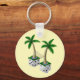 Dos dados blancos con palmeras creciendo en la parte superior, unidos por una hamaca. Los árboles también están rodeados de hierba y estanques de agua que están cayendo por los costados de los dados.