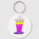Una torta gigante de cumpleaños con helados rosados y amarillos, hielo goteando y velas azules brillantes.