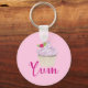 Una cadena de llaves con un delicioso quequito rosado con ribetes escrupulosos de helado rosa con un portapapeles amarillo. Una frambuesa con tallo y hojas en la parte superior. Soñador y delicioso. El texto dice Yum con un elegante y moderno tipo de letra. Situado en un entorno rosa pastel.
