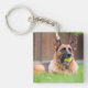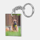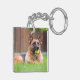 Perra pastora alemana con una bola de tenis en la boca sentada sobre hierba.