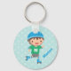 Pequeño patinador lindo con casco azul, con engranajes protectores y patines de rodillos. ¡Personaliza la cadena de claves incluyendo el alfabeto en el tee del niño!