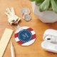 Un sencillo, moderno, de rayas rojas y blancas con tu inicial en una fuente moderna, en un preppy, etiqueta de círculo náutico, azul marino, pancarta, marco con un borde de línea blanca punteado. GraphicsByMimi© Patrón de líneas de moda, elegantes, mod, negrita que puedes personalizar con tu monograma para ella. Utilice el campo de plantilla para agregar su original o letra de monograma o seleccione "personalizar" para más opciones de edición como agregar su nombre, texto o foto para hacer su propio diseño personalizado único. Hay otros colores disponibles.